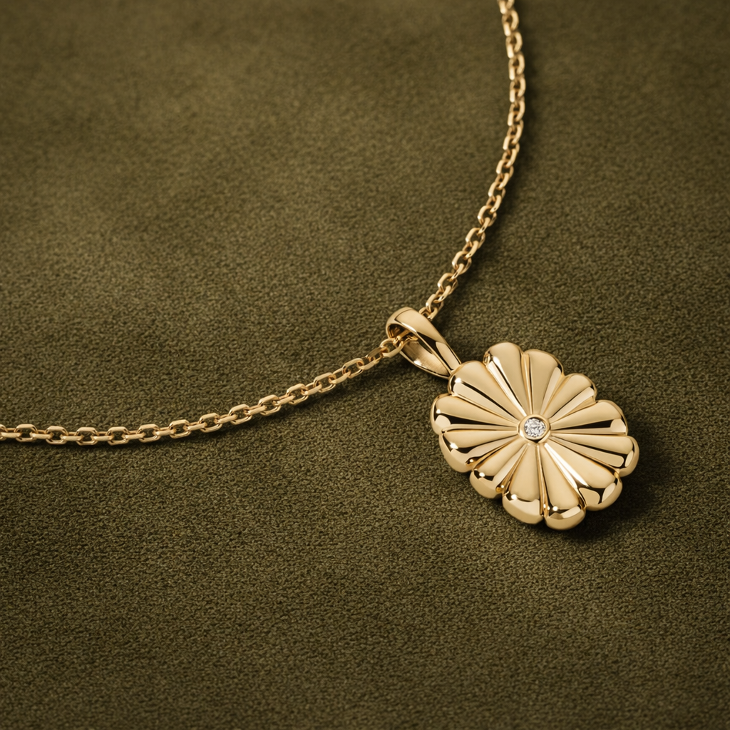 A sculptural gold pendant with soft radial fluting, designed to catch the light and feel easy to wear everyday.