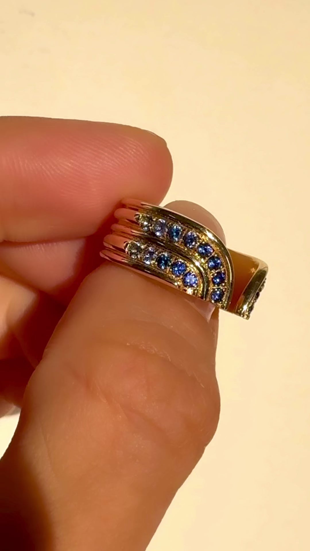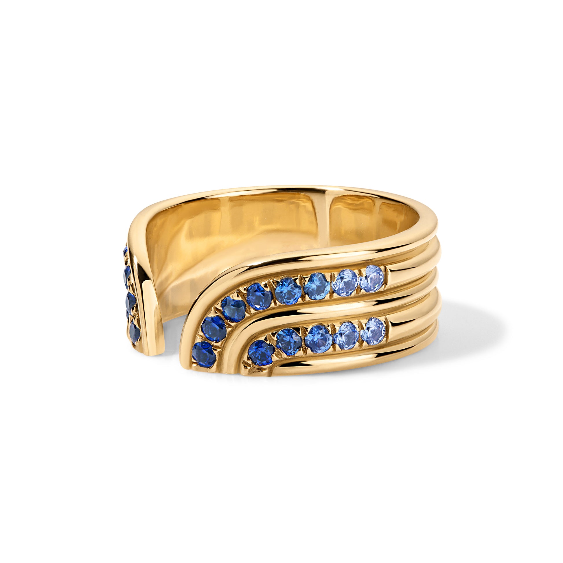 This modern, minimal ring showcases chic elegance in every detail. Meticulously crafted from 14K yellow gold, it features crisp bands adorned with alternating rows of blue sapphires. Every single stone is carefully hand selected in order create a stunning ombre effect, transitioning seamlessly from vibrant blue to soft azure. This ring was designed with stacking in mind. Pair it with a simple band or wear two of them together for a bold look.