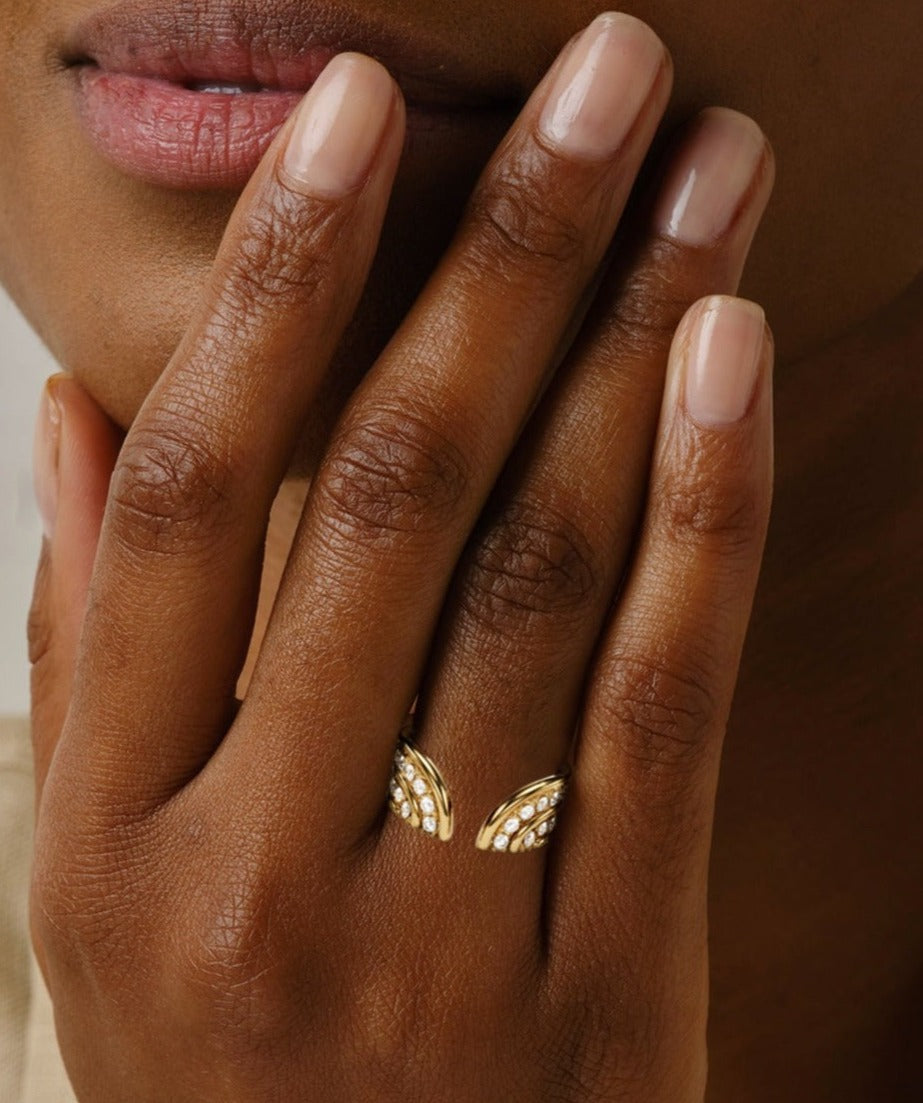 This modern yet minimal ring exudes chic and elegance. Meticulously crafted in 14K yellow gold, its crisp banded detail boasts alternating rows of pave diamonds that seamlessly curve and embrace the finger with a graceful flourish. This piece radiates an aura of refined coolness that's hard to resist. Its understated elegance will elevate any ensemble with its subtle yet striking presence.